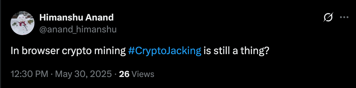Crypto jacking isn’t dead, it has just gotten smarter. Attackers now prioritize stealth over brute-force resource theft, using obfuscation, WebSockets, and infrastructure reuse to stay hidden.