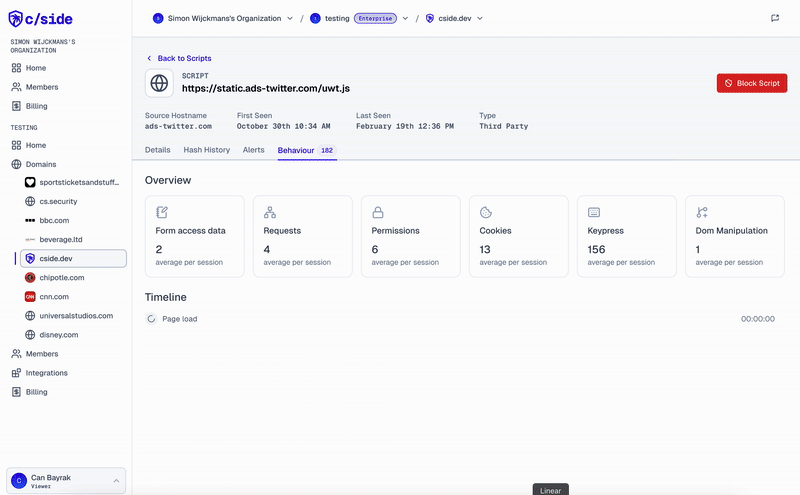 If a script reads a user’s email address or sends it to an external server, the dashboard will record this. If a session token is sent to a tracking pixel or analytics domain, that will also appear. This information can help teams detect accidental exposures or policy violations before they escalate.