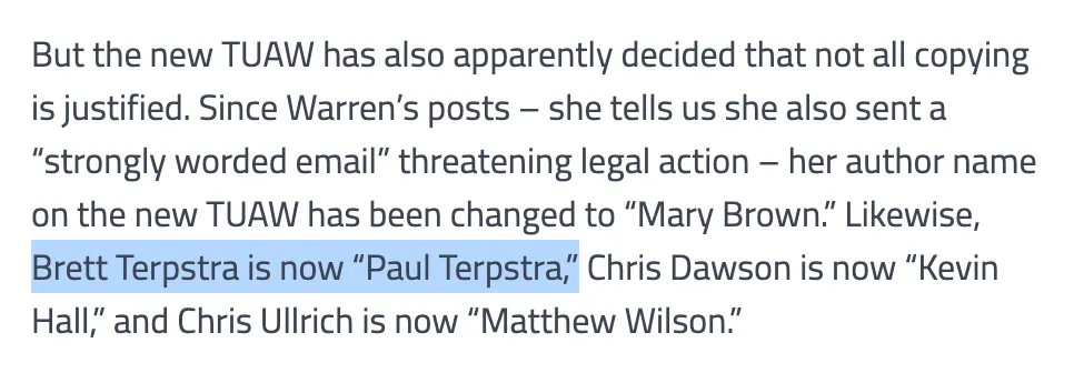 LabelCantine dug a bit deeper a few weeks ago, and found that Tuaw changed the name of the old reporters after threatening legal action: