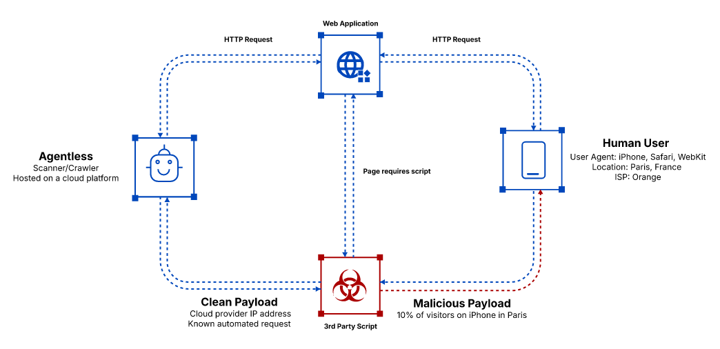 - Crawler/Scanner/Agent-less solutions suffer by design from limited visibility. Allowing a bad actor to detect the scans and honeypot the security scanner by serving benign code, while serving malicious code to end-users.