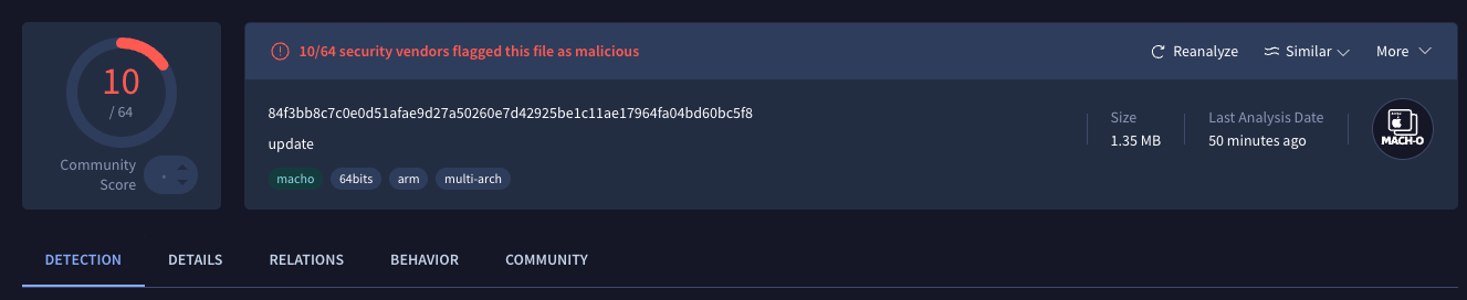 This shell script then downloads a macOS executable (detected by 10 antivirus engines on VirusTotal).