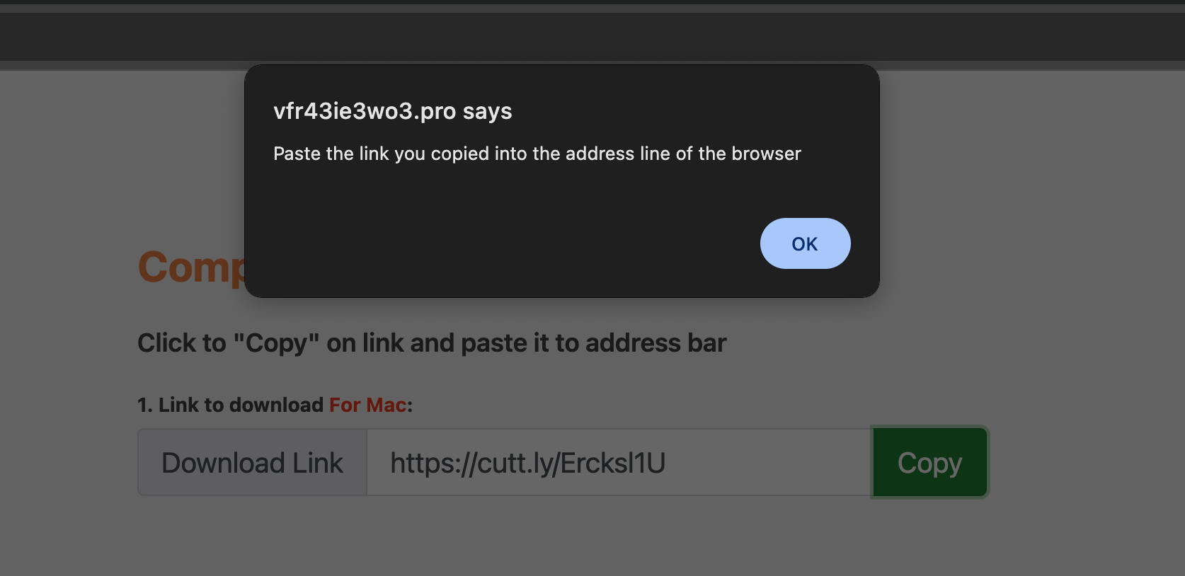 This mimicked URL shortener page brings the following pop-up: