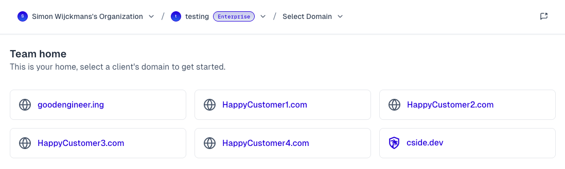 - Teams are fully isolated from one another. End customer can be invited to this team. The team contains the various domains of a customer.