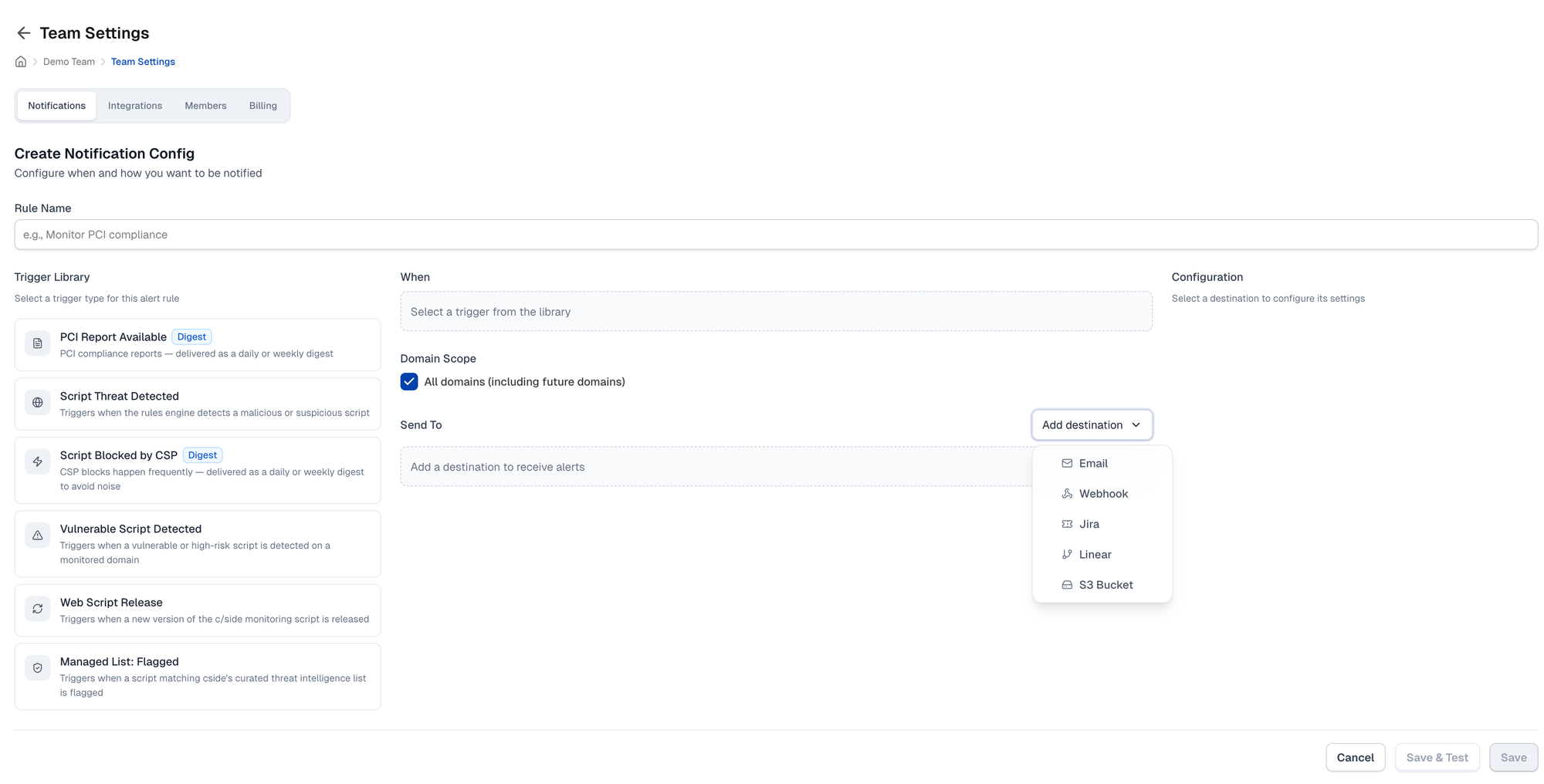 We’re excited to release our notifications engine. This is designed to give your team real time visibility into security alerts, exactly where they are required. Webhook notifications allow for you to add an endpoint URL directly to your dashboard for your domain(s) which can be used for integrations with slack, discord or your preferred platform. You can also receive alerts to your own AWS S3 bucket in a .csv file format, which can be used to integrate with your own internal workflows or preferred logging / SIEM platforms.